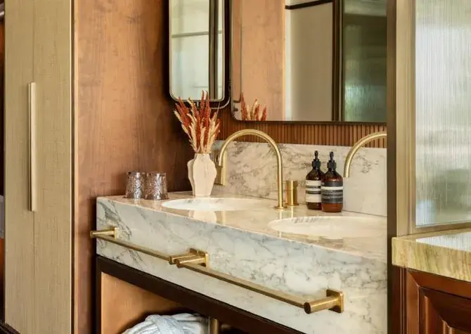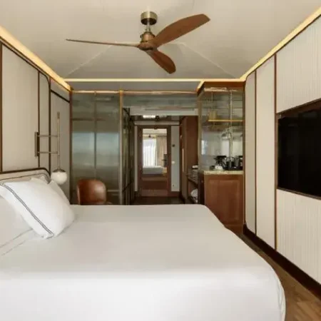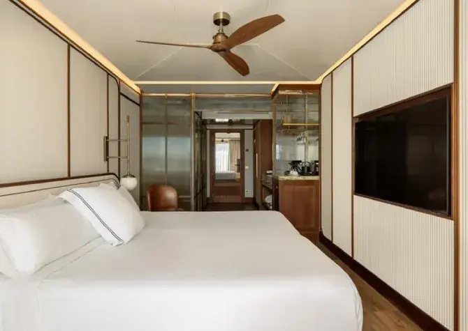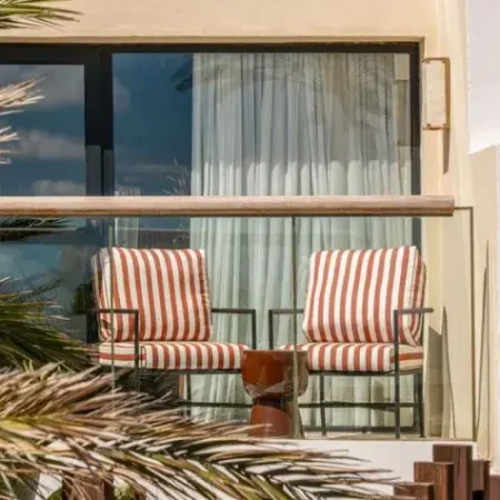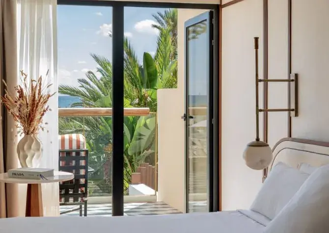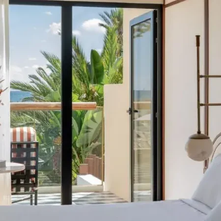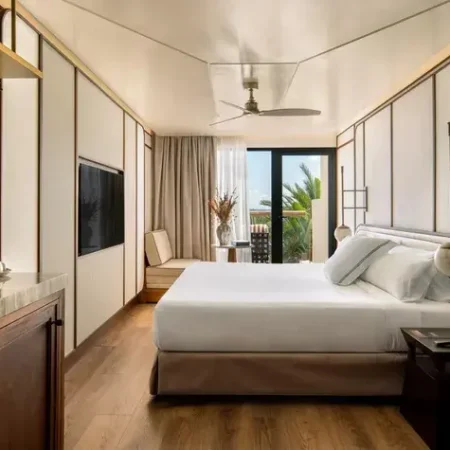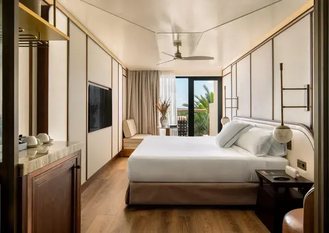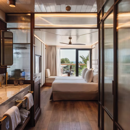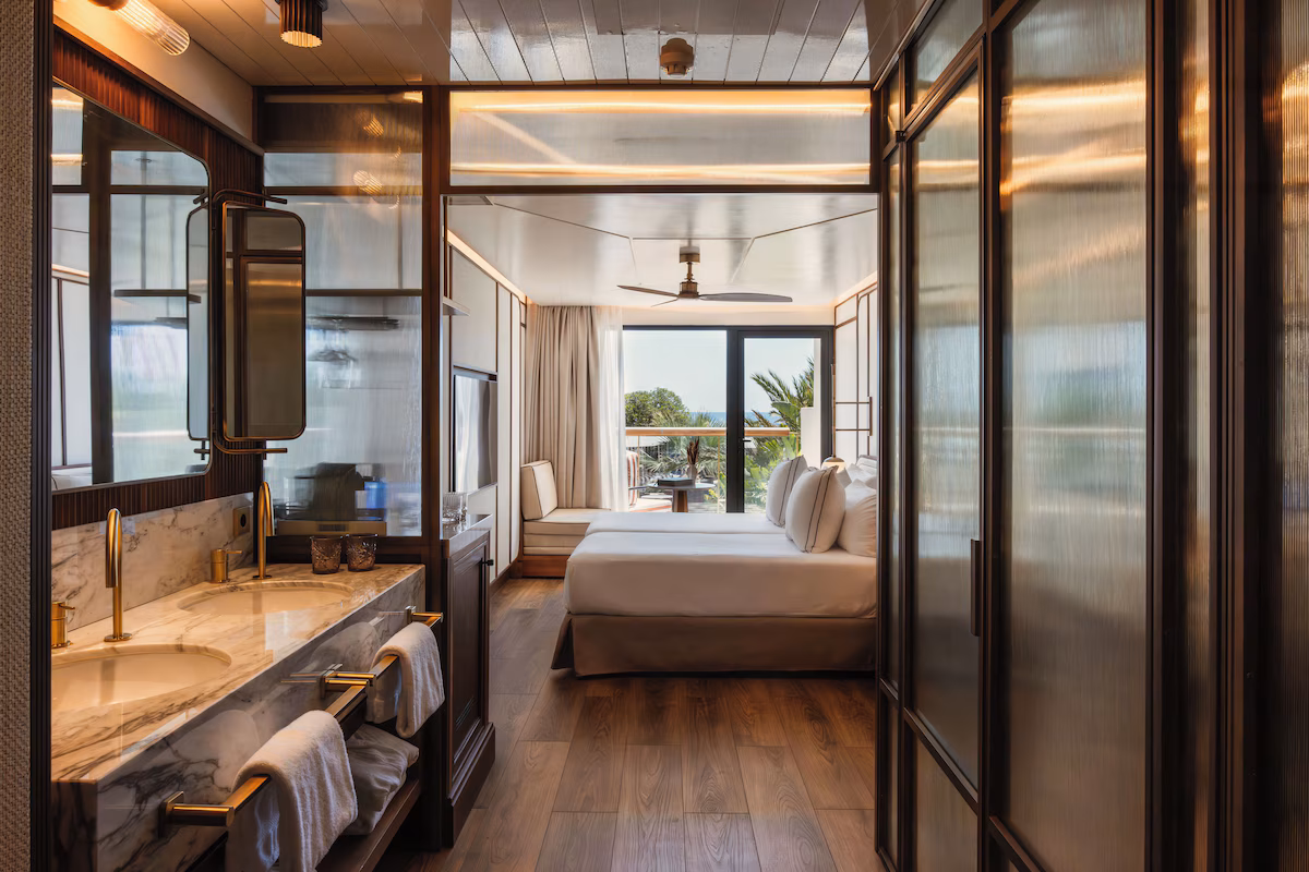 Modern rooms in soft earth tones featuring a king-size bed or twin beds, high-end bedding, sensory shower, separate toilet, 55’’ flat-screen TV, minibar, club and pool views, and a furnished terrace.